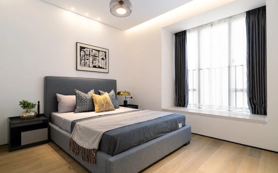 整体白色墙面和柜体,搭配深灰蓝色的床品,经典而通透的色调展现出一份优雅与闲适。黄色抱枕,带入一份温馨,与蓝白交叠出一份悠然与恣意。